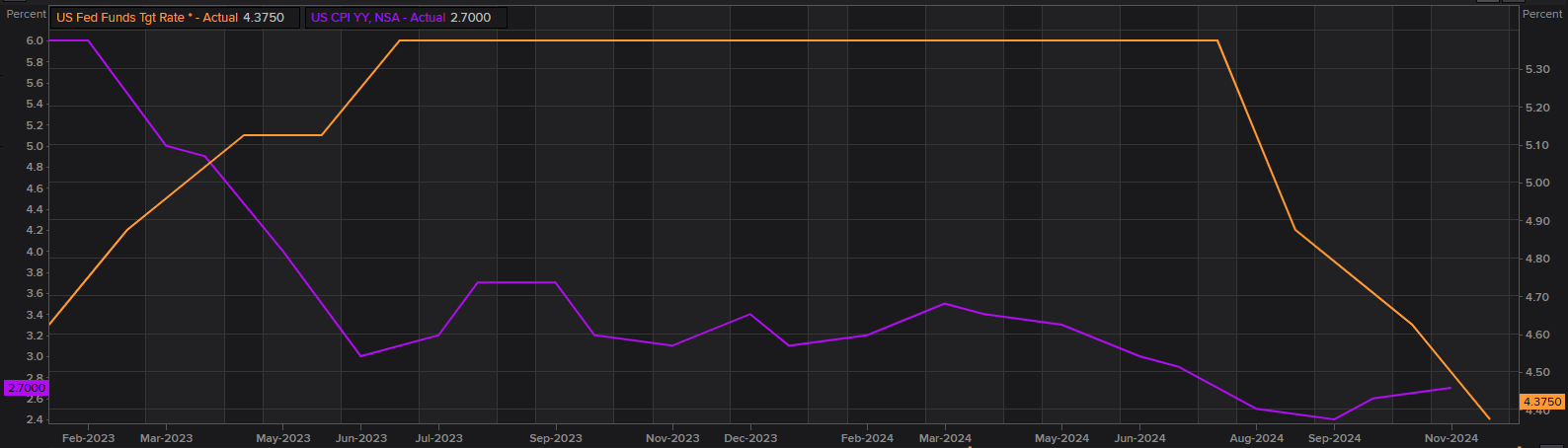 На последнем заседании в году ФРС снова подчеркнула важность инфляции, отметив, что решение о снижении ставки было «на грани» (close call). Регулятор сигнализировал о более медленном темпе снижения ставок в 2025 году, учитывая, что инфляция остается выше целевого уровня, а экономика выглядит достаточно устойчивой.