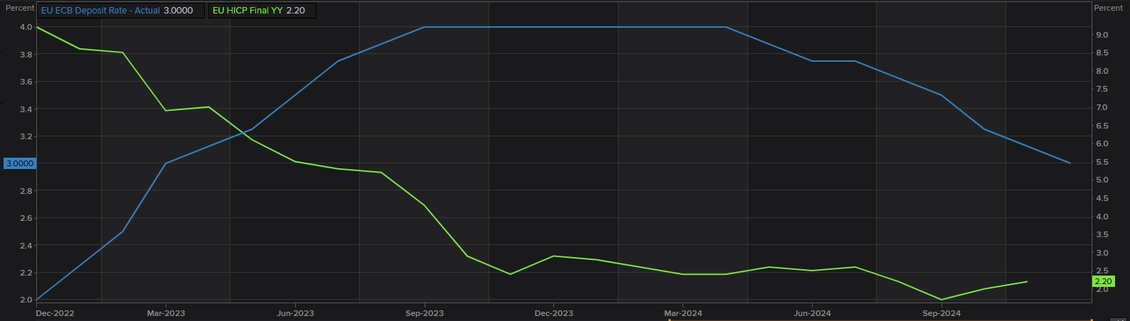 В 2024 году инфляция действительно снизилась по сравнению с рекордными пиками 2022-го. Гармонизированный индекс потребительских цен (HICP) в сентябре 2024 года составил 1.7% г/г (против 10.6% два года ранее). В октябре и ноябре индекс подрос, достигнув 2.2% в ноябре.