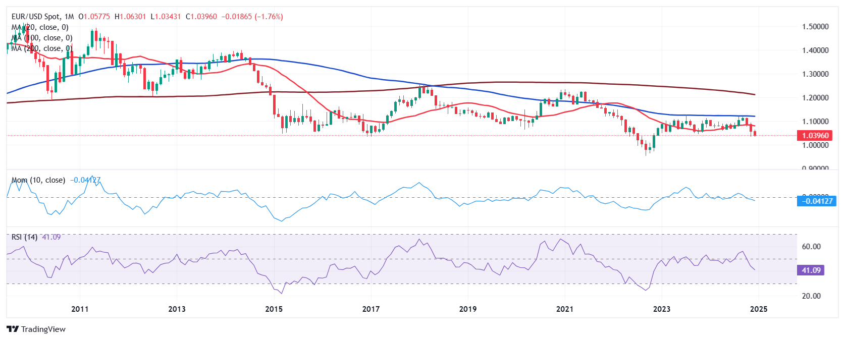 Пара EUR/USD заканчивает третий месяц подряд в красной зоне, и технические индикаторы на месячном графике указывают, что 2025 год будет непростым для евро. Котировки почти два года торговались выше 20-дневной скользящей средней (SMA), но в ноябре ушли ниже этой линии. Параллельно 100 SMA выступала в роли динамического сопротивления, отталкивая покупателей в районе 1.1200.