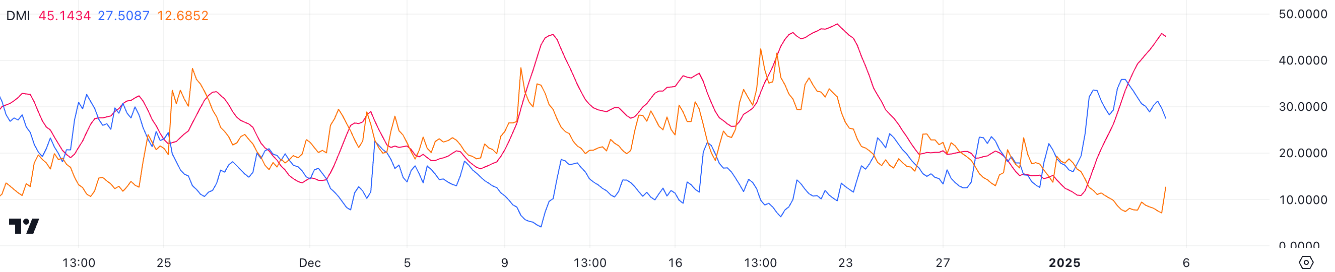 Средний направленный индекс (ADX) для SOL достиг отметки 45, что значительно выше минимальных значений в 10.8, зарегистрированных четыре дня назад. Этот индикатор подтверждает наличие сильного тренда на рынке.