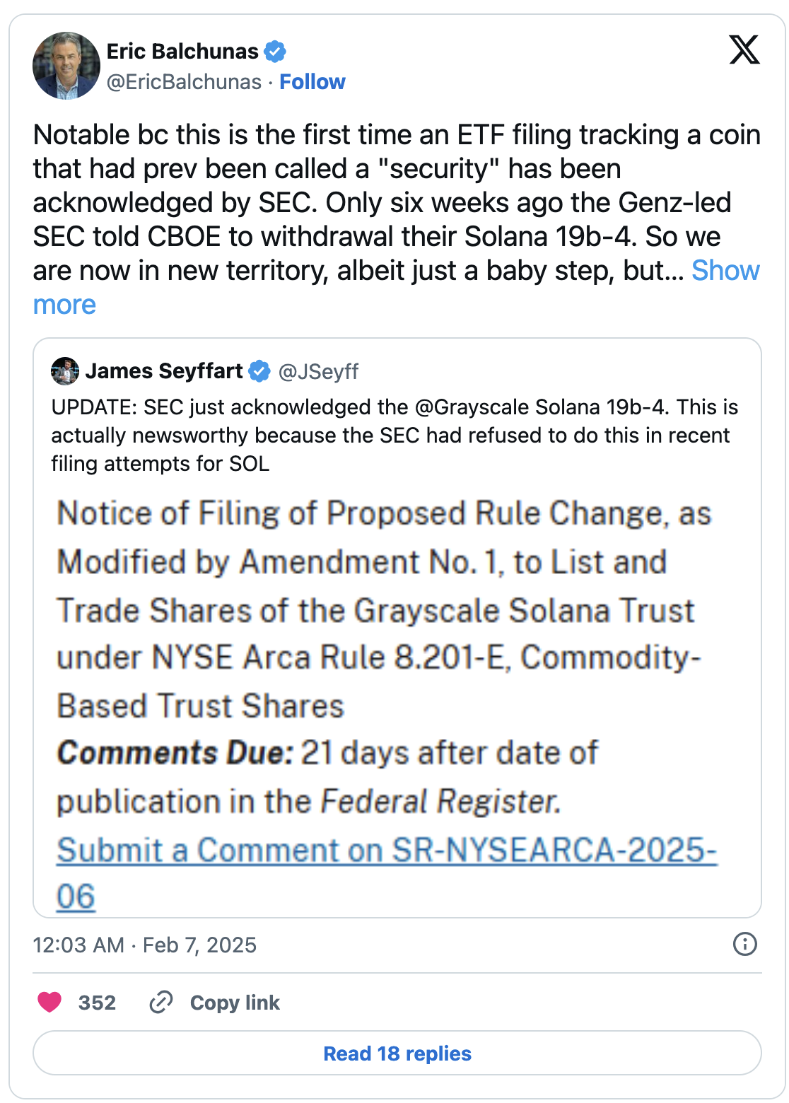 Балчунас также отметил смену руководства SEC, намекнув, что новое руководство ведомства может продвигать более гибкую политику в отношении цифровых активов. Фактически это соответствует решениям Дональда Трампа, который выступил за гармонизацию крипторегулирования и призвал ускорить процесс внедрения цифровых активов.