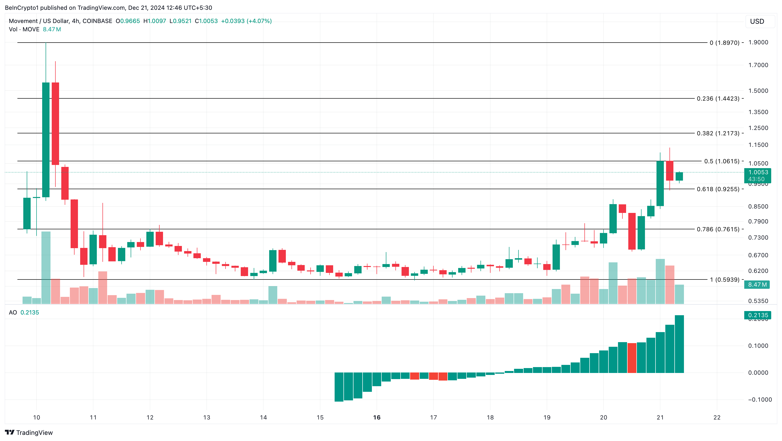 Индикатор Awesome Oscillator (AO) на 4-часовом графике показывает рост, что указывает на сохраняющийся позитивный настрой среди инвесторов.
