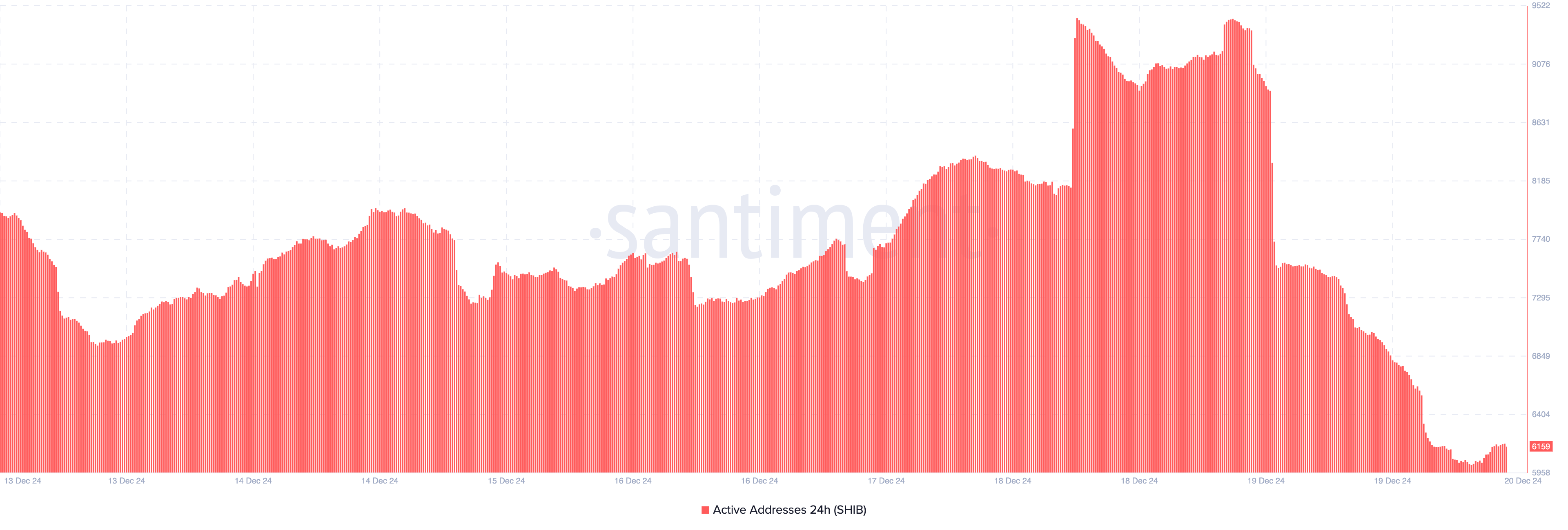 Данные от Santiment показывают значительное снижение количества активных адресов Shiba Inu. Активные адреса измеряют число уникальных кошельков, которые взаимодействуют с токеном за определенный период времени. Снижение этого показателя указывает на ослабление интереса к SHIB и снижение объемов успешных транзакций.