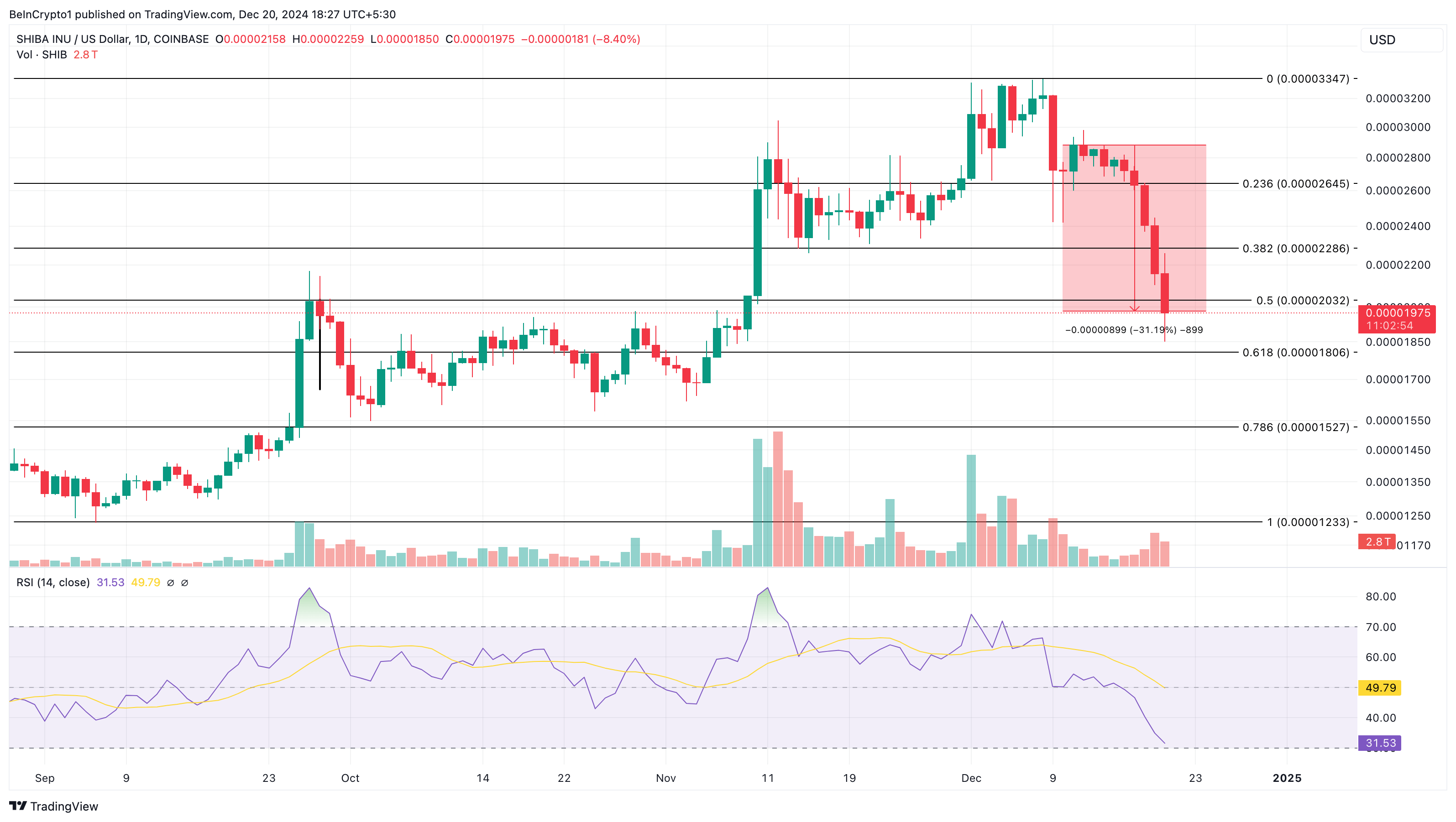 На момент последней попытки роста 11 декабря цена SHIB достигала $0.000029. На 4-часовом графике текущий индекс относительной силы (RSI) находится на уровне 31.53, что указывает на медвежий импульс. RSI ниже 50 сигнализирует о продолжающемся нисходящем тренде.