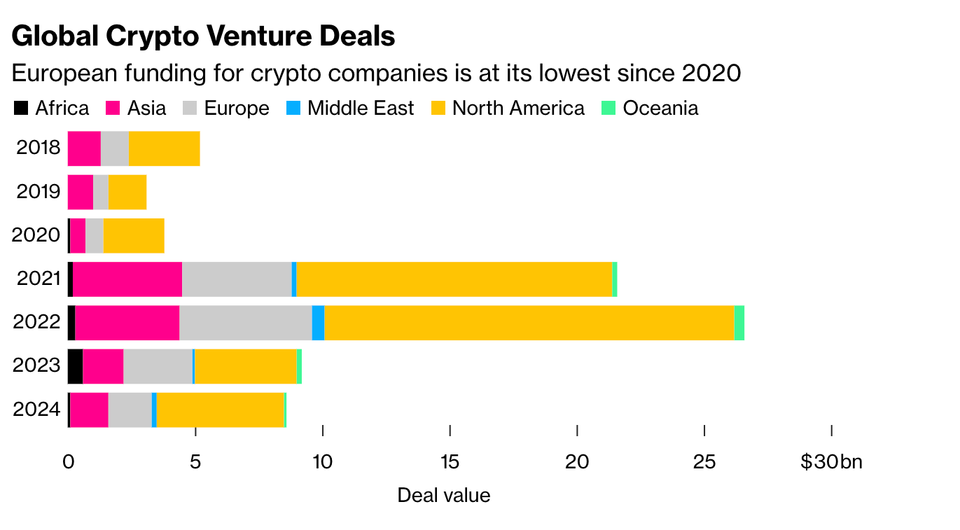 Tether играет ключевую роль в обеспечении ликвидности и является важным инструментом для операций с криптовалютами в ЕС. Однако из-за MiCA европейские инвестиции в криптовалюты уже снизились в 2024 году по сравнению с другими регионами.