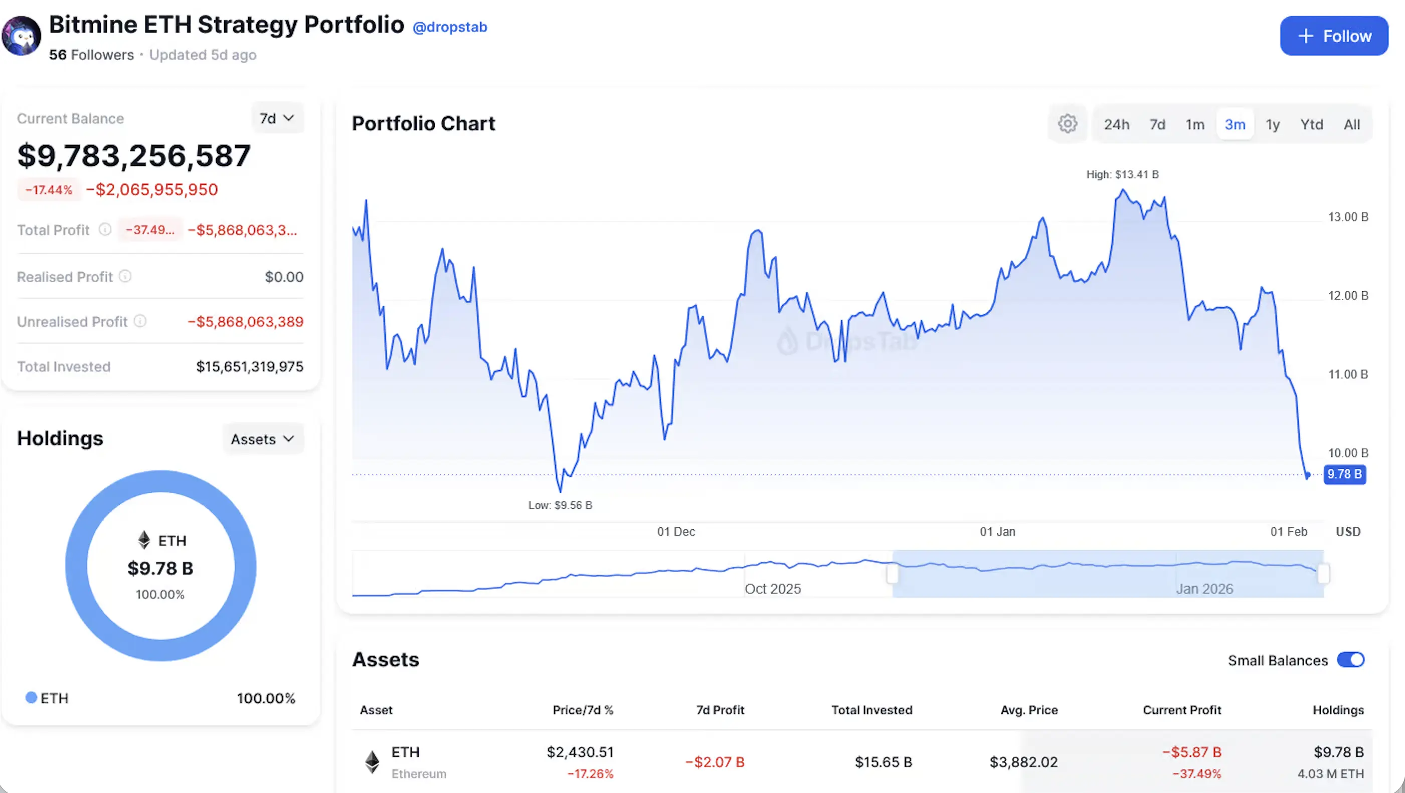 Под удар попал и известный Ethereum-пермабулл Том Ли. Его компания Bitmine (BMNR) оказалась в глубоком минусе. По данным DropsTab, портфель стратегии на ETH за последние сутки потерял ещё 865 млн долларов.