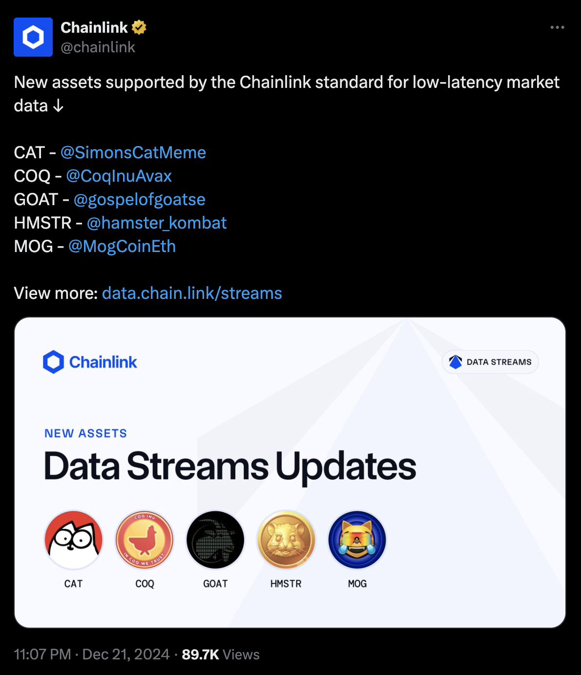 Chainlink Integrate new memecoin data streams | Source: X.com/Chainlink, December 21, 2024