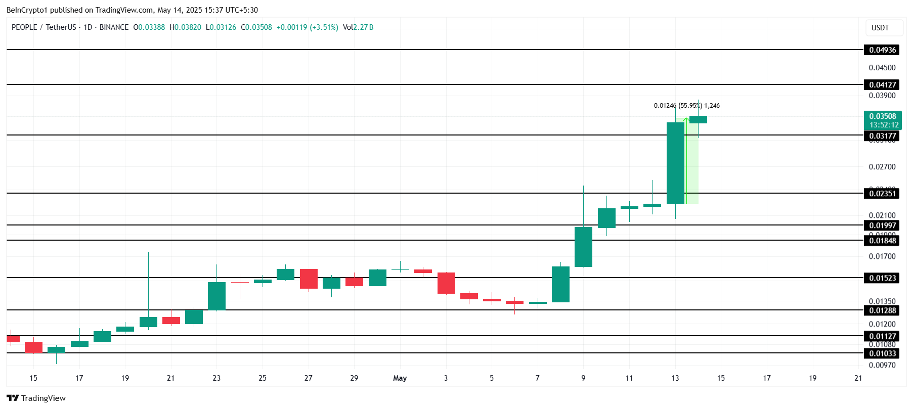 Токен PEOPLE уверенно закрепился в числе лучших активов дня, прибавив 56% и достигнув цены 0.035$. Основная задача на ближайшее время — удержать уровень поддержки 0.031$. Закрепление выше этой зоны может открыть путь к следующей цели на уровне 0.041$, что может усилить покупательский импульс.