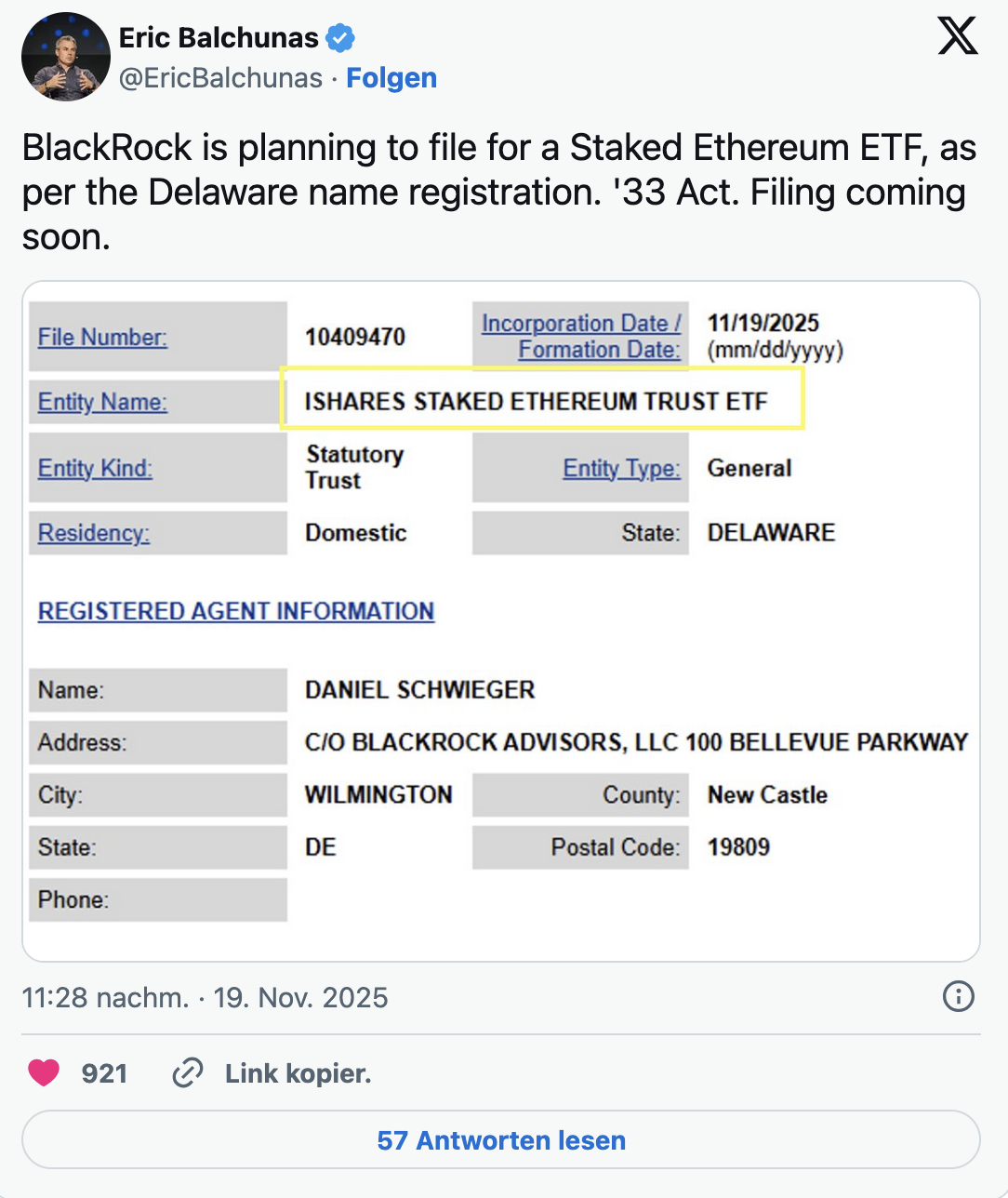 A new filing in Delaware confirms the creation of the iShares Staked Ethereum Trust ETF — a clear sign that the company intends to expand its existing ETH ETF with a staking component. According to ETF analyst Eric Balchunas, this registration is an early step ahead of an expected SEC submission.