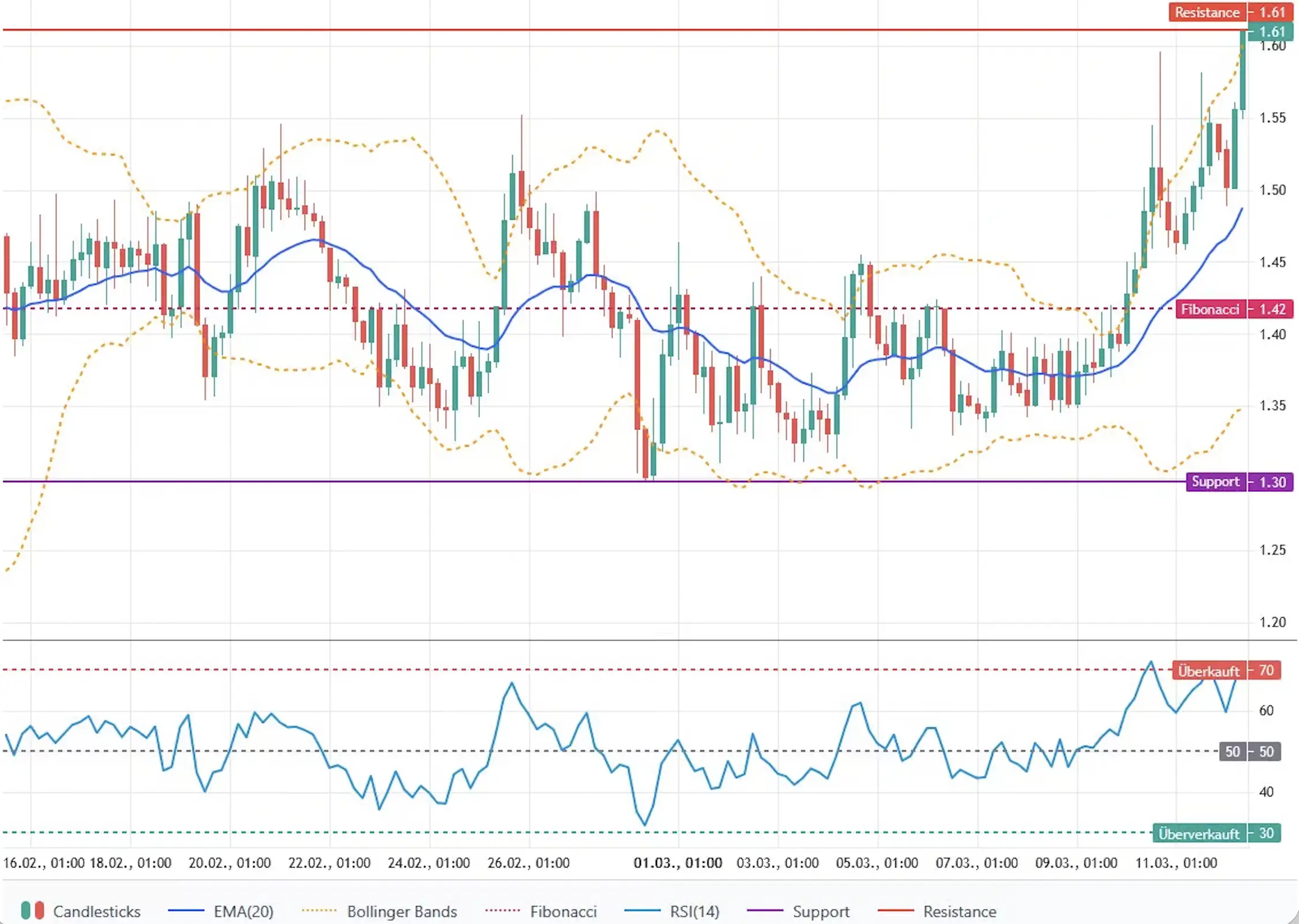 The nearest support levels are located at 1.556$ and 1.48763$ (EMA-20). Immediate resistance is positioned around 1.611$. As long as the price remains above the EMA-20, the short-term technical outlook remains bullish.