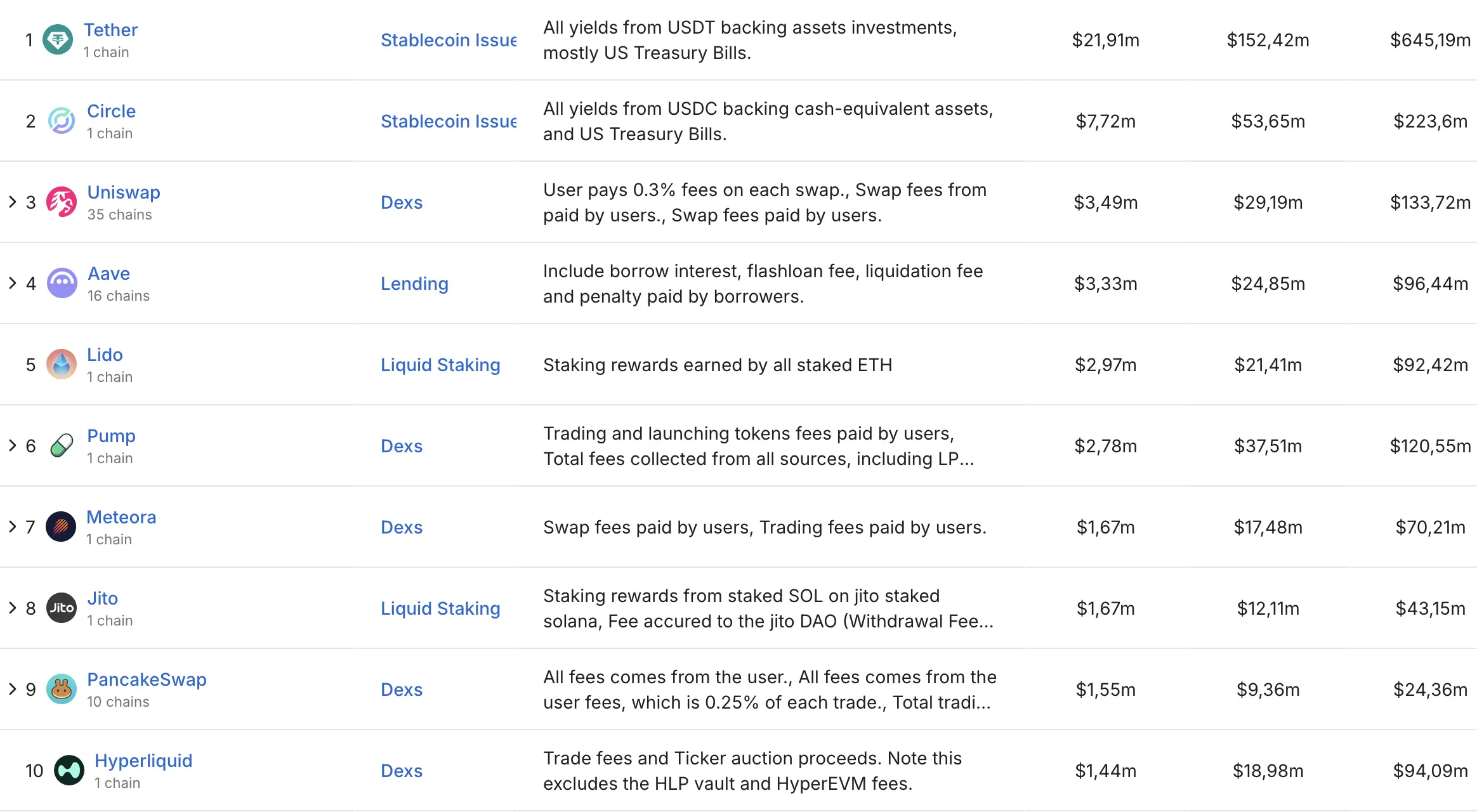 Among DeFi protocols, only decentralized exchanges Pump.Fun ($39.4 million) and Uniswap ($29.2 million) generated more. Still, all three lag well behind stablecoin issuer Tether, which posted revenues exceeding $152 million.