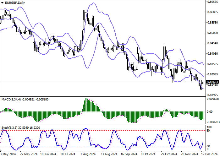 Полосы Боллинджера на дневном графике демонстрируют довольно активное снижение: ценовой диапазон сужается, отражая появления восходящей динамики в сверхкраткосрочной перспективе. MACD растёт, сформировав слабый сигнал на покупку (гистограмма пытается закрепиться выше сигнальной линии). Стохастик демонстрирует похожую динамику, отступая от минимальных значений, сигнализирующих о рисках перепроданности единой валюты в сверхкраткосрочной перспективе.