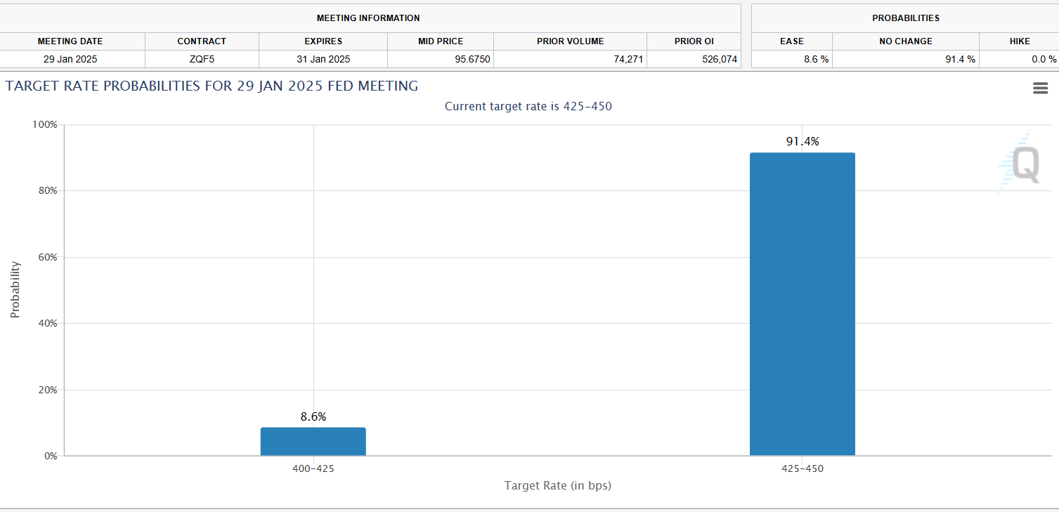 Вероятность, что в январе ФРС сохранит ставку без изменений, оценивается примерно в 91%, а в марте шансы на паузу близки к «50 на 50», согласно инструменту FedWatch от CME Group.