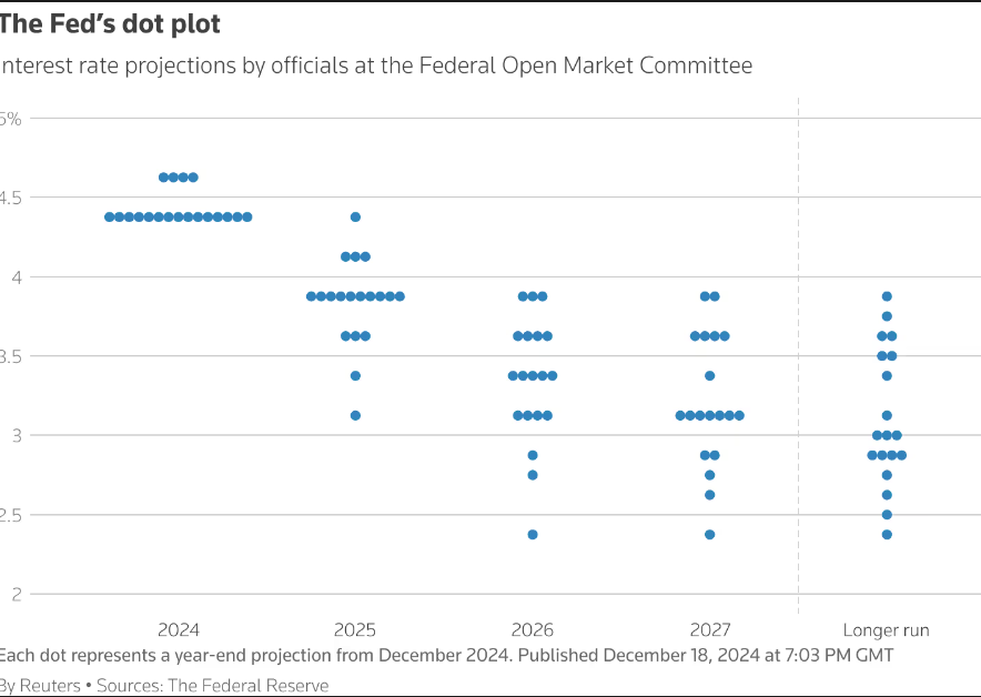 Исходя из этого, представители ФРС теперь намечают лишь полпроцента снижения ставки в следующем году вместо одного полного процентного пункта, который закладывался в сентябре.