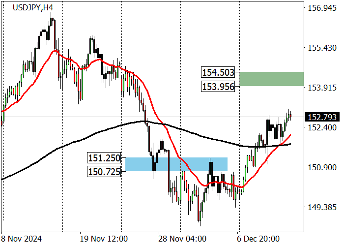 Среднесрочный тренд является нисходящим: в конце ноября цена преодолела зону 151.25–150.72 и направилась к зоне 2 (146.12–145.63). В данный момент котировки корректируются к области сопротивления тренда 154.50–153.95, после теста которой станут актуальными короткие позиции с целью 148.70.