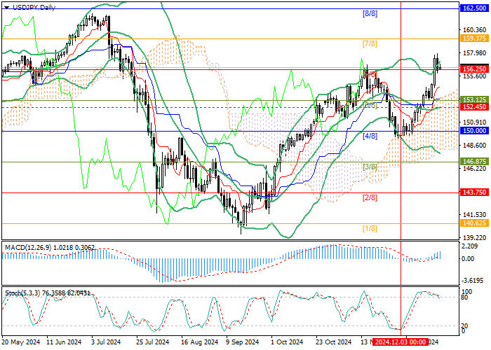 Торговый инструмент поднялся выше отметки 156.25 (уровень Мюррея [6/8]) и может достичь района 159.37 (уровень Мюррея [7/8]) и 162.50 (уровень Мюррея [8/8]), однако в случае преодоления области поддержки 153.12–152.45 (уровень Мюррея [5/8], средняя линия полос Боллинджера) вероятно снижение в район 150.00 (уровень Мюррея [4/8]) и 146.87 (уровень Мюррея [3/8]).