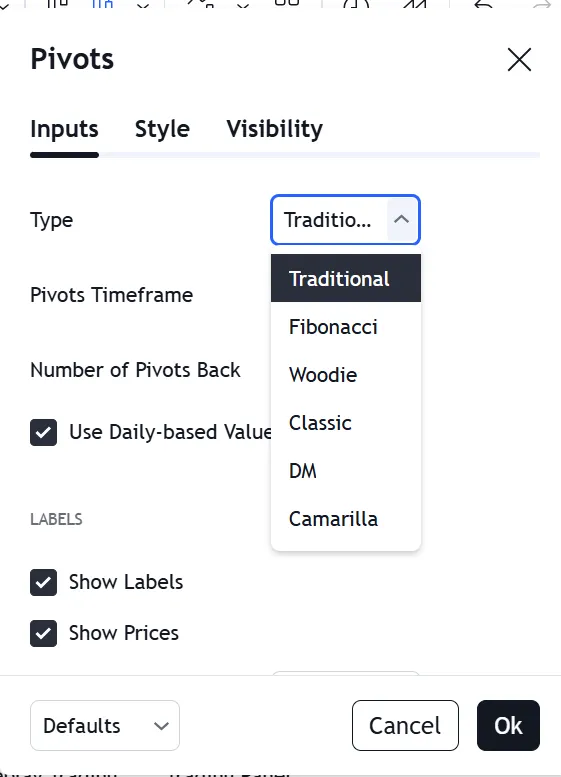 - Подключите «Pivot Points Standard», выбрав в настройках Camarilla, чтобы видеть полные R1–R4 и S1–S4.
