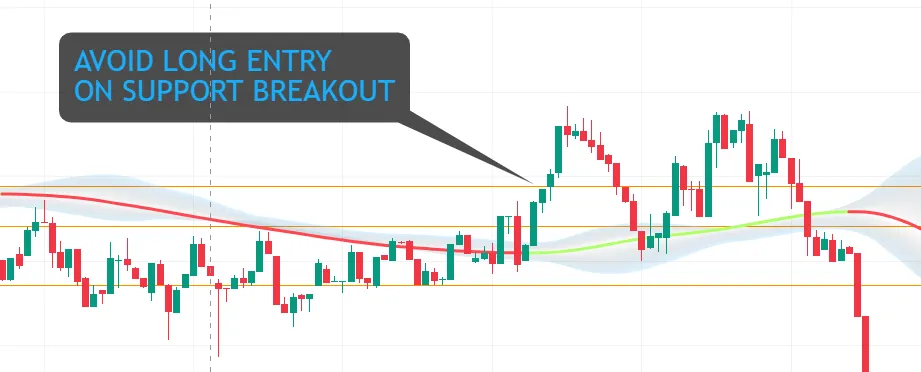 - Проверка тренда. Kalman с «зелёными» зонами означает бычий тренд, а «красными» — медвежий. Также смотрите, где расположена цена относительно этой цветной ленты.