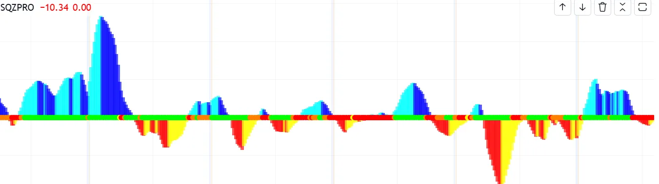 - Squeeze Pro: появляется зелёная точка, а гистограмма окрашивается в голубой (bullish) тон.