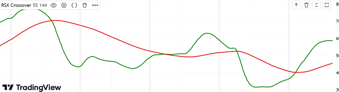 - Бычий (Bullish) кроссовер: линия RSX поднимается выше сигнальной линии, указывая на рост импульса.