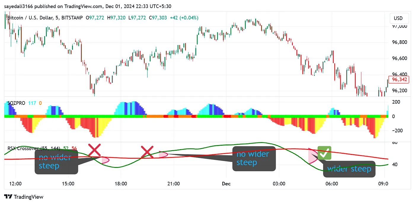 - Угол пересечения > 45°: если разница между RSX и сигнальной линией явно увеличивается, это усиливает сигнал.