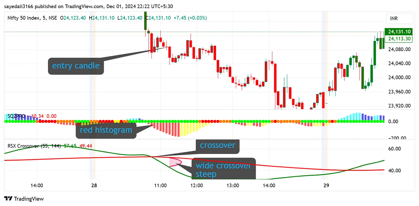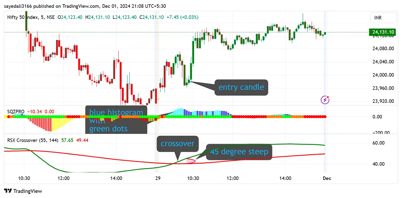 - Ждите чётких сигналов пересечения RSX и появления зелёной точки Squeeze Pro.